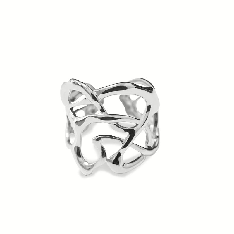 L'anello Hollow abbina una forma ampia e avvolgente a un motivo leggero e geometrico che lascia intravedere la pelle. Un gioiello di carattere, senza appesantire.