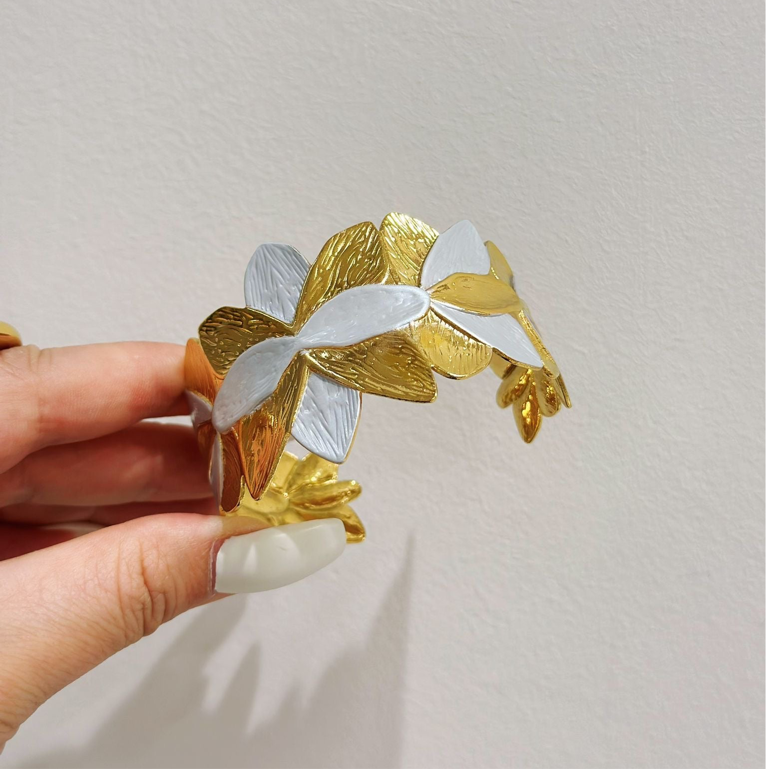 Un bracciale rigido che non ha bisogno di urlare per farsi notare. Le forme astratte ricordano petali delicati, tra finitura gold e dettagli bianco perlato: morbido all’occhio, deciso al polso.