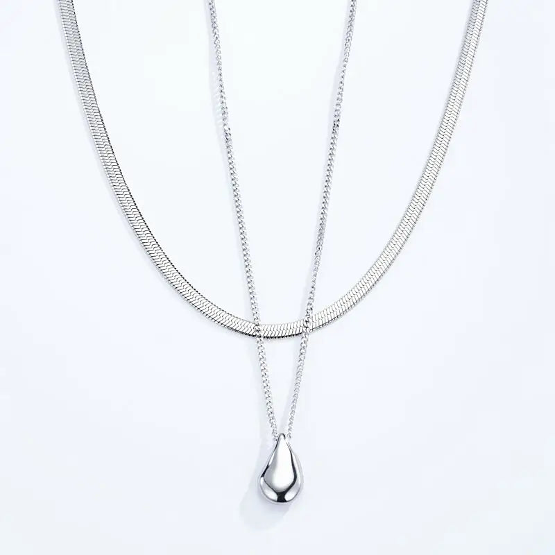 Collana doppia composta da una catena snake minimal e da una catena più lunga con pendente a goccia liscia. Un design pulito ed elegante che si abbina facilmente a qualsiasi look, perfetto per chi ama i dettagli moderni e versatili. Disponibile sia in versione gold che silver.
