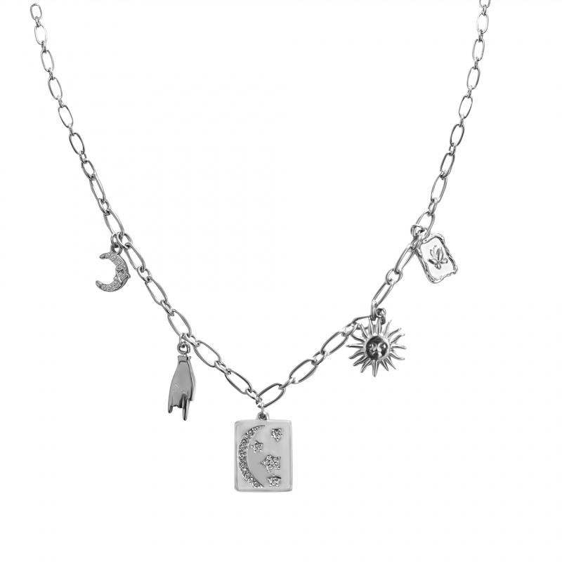 Un mix di simboli, luce e ironia. Cosmic Mood è una collana in catena d’acciaio disponibile sia in gold che in silver, decorata con cinque charm pendenti: due medagliette, una mano che fa le corna, un sole e una luna. Un design energico e leggero, perfetto per aggiungere un significato (o una battuta) a ogni look.