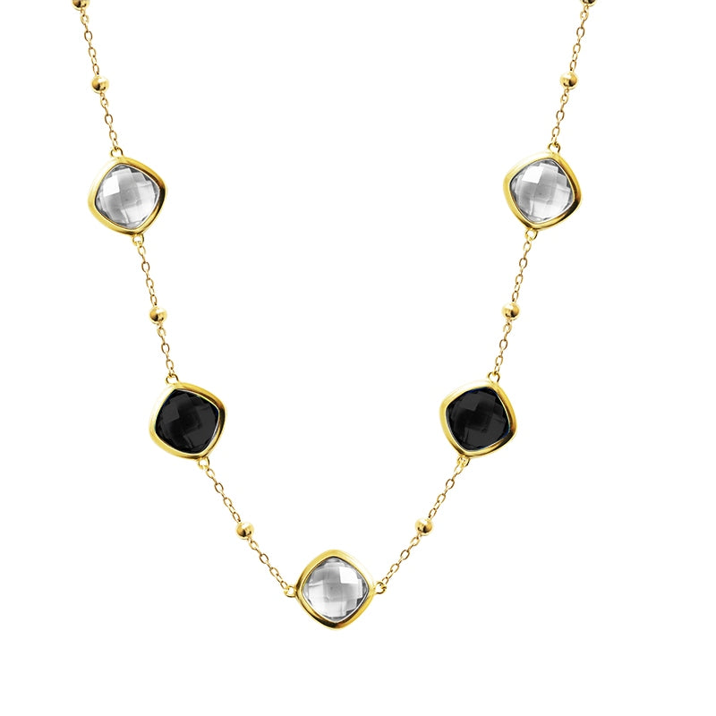 La collana Cubica è geometrica ed elegante: cristalli quadrati luminosi su base dorata, disponibili in varianti colore decise per dare carattere ad ogni look.