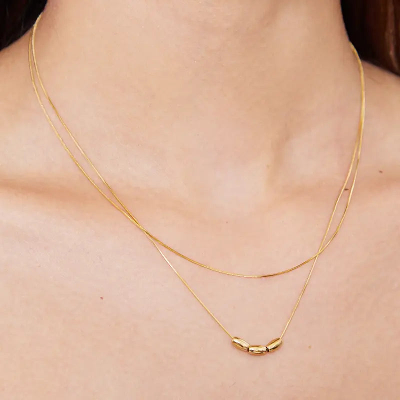 La collana doppia Duo Beads è la scelta perfetta per chi ama la stratificazione senza sforzo. Due catene sottili e leggere si sovrappongono: la prima semplice ed essenziale, la seconda arricchita da tre elementi geometrici metallici che donano un tocco moderno e sofisticato. Facile da indossare ogni giorno, si abbina con qualsiasi look, dal casual al più elegante.