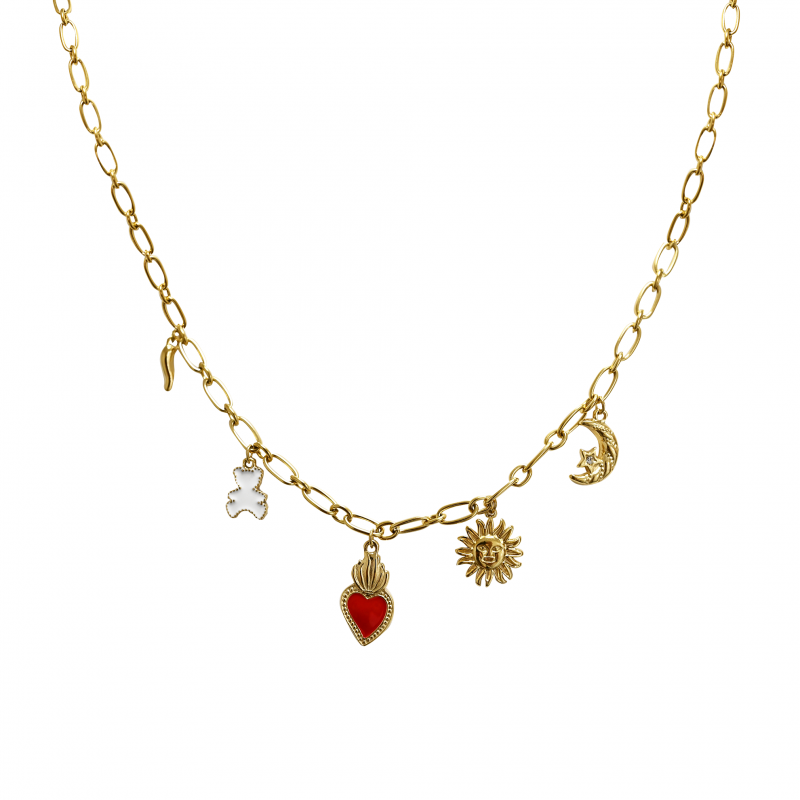 Un mix tenero, simbolico e brillante. Lucky Teddy è una collana in catena d’acciaio, disponibile in gold e silver, decorata con 5 charm pendenti: una luna, un sole, un teddy bear, un cornetto portafortuna e un cuore sacro smaltato rosso.