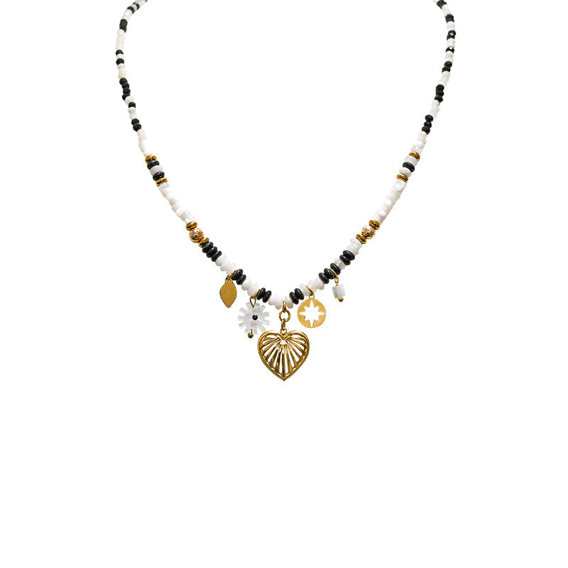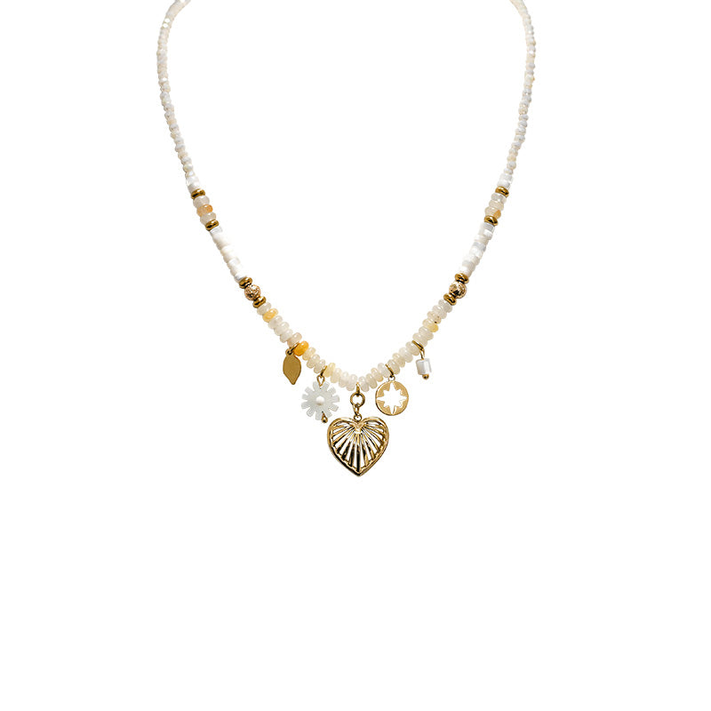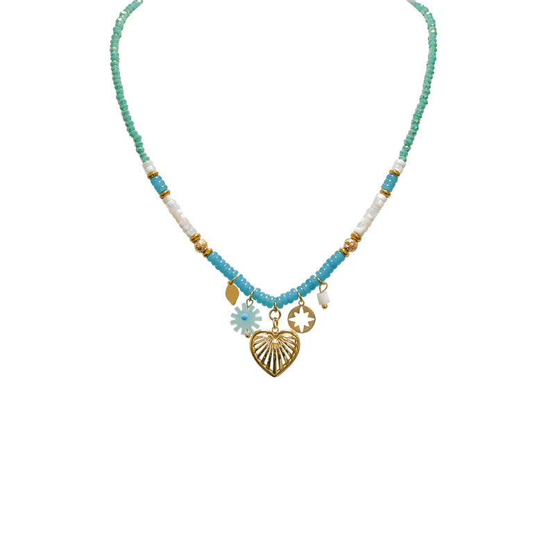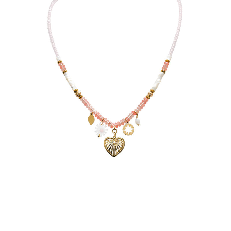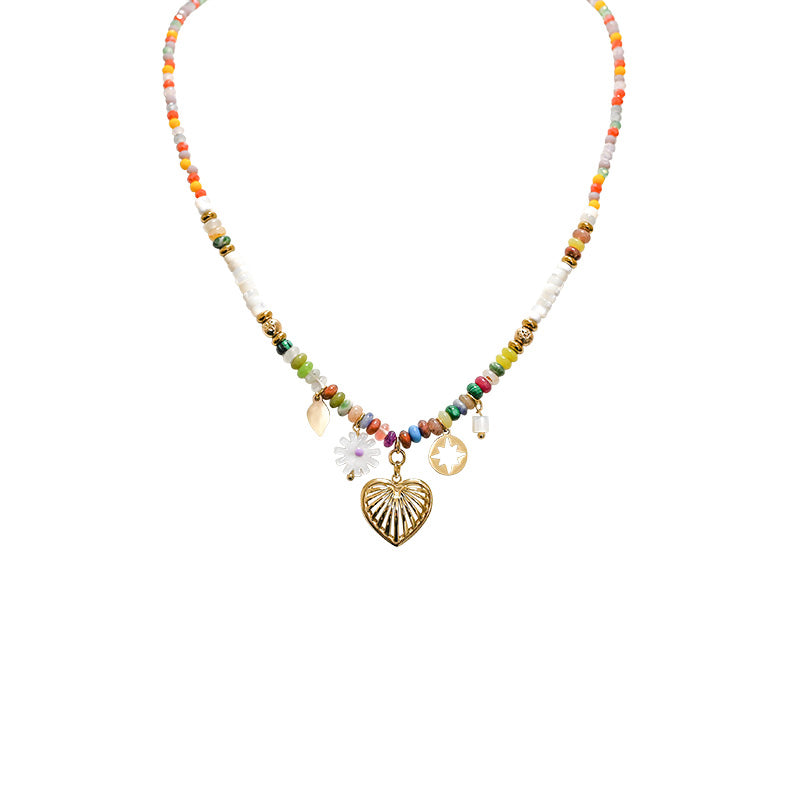 Mini Charms è una collana sottile e leggera, composta da cristalli colorati e arricchita da 5 charm delicati in acciaio, pietra o cristallo. Ogni elemento è pensato per creare riflessi morbidi e movimento, senza mai appesantire il look.