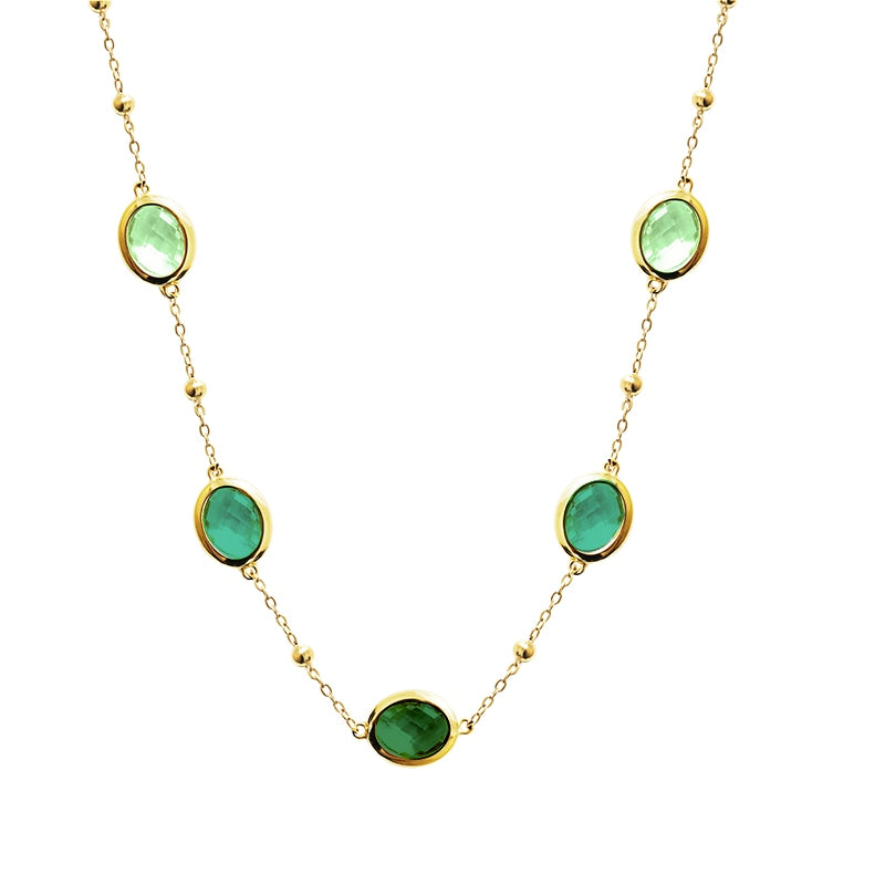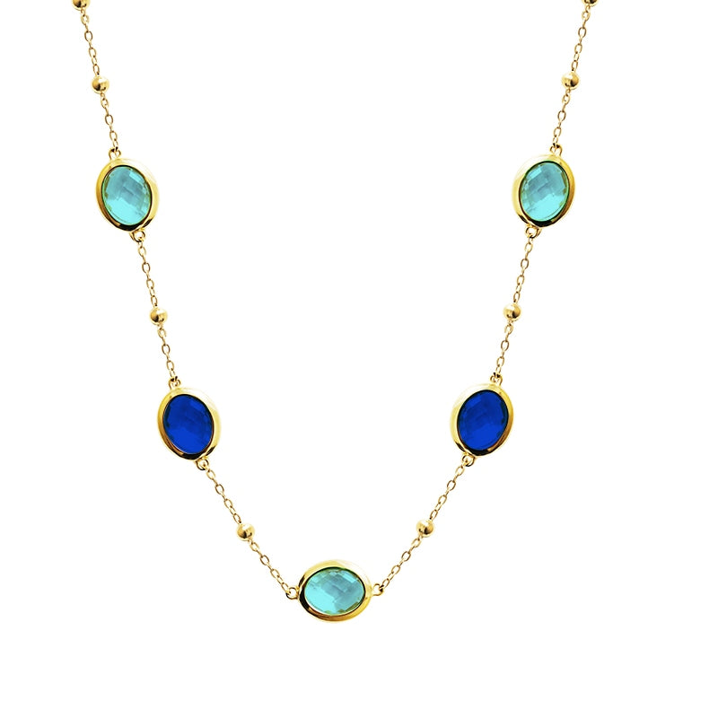 La collana Ondas è un richiamo al movimento e alla luce del Mediterraneo: cristalli ovali luminosi che scivolano lungo una catena dorata, disponibili in varianti colore decise e versatili.