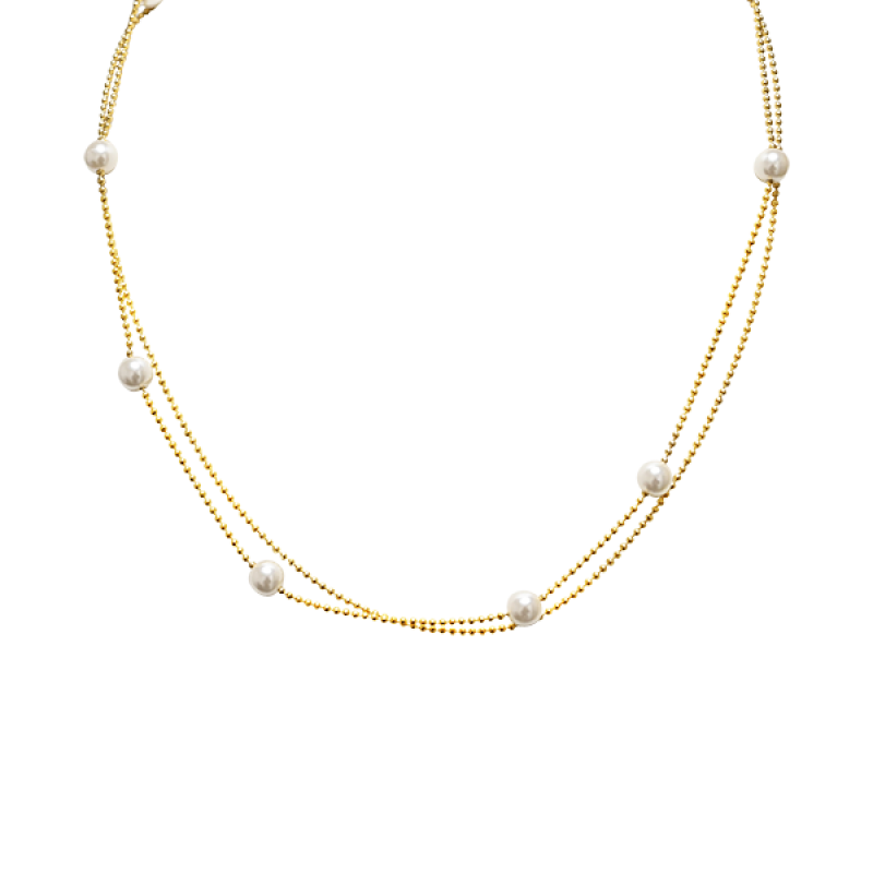 Due fili, una sola eleganza. Pearly Duo è la collana a doppia catena con perle distribuite lungo la maglia di piccole sfere: delicata, luminosa, essenziale.