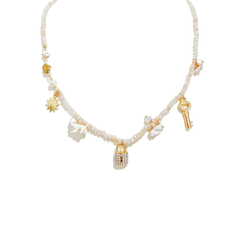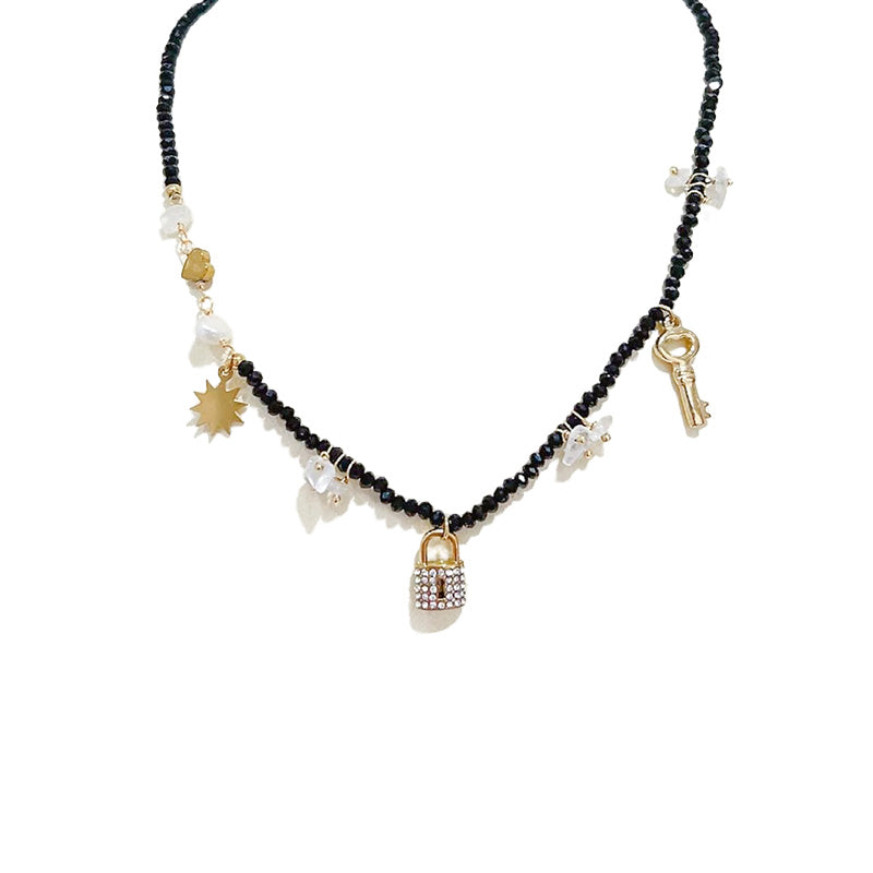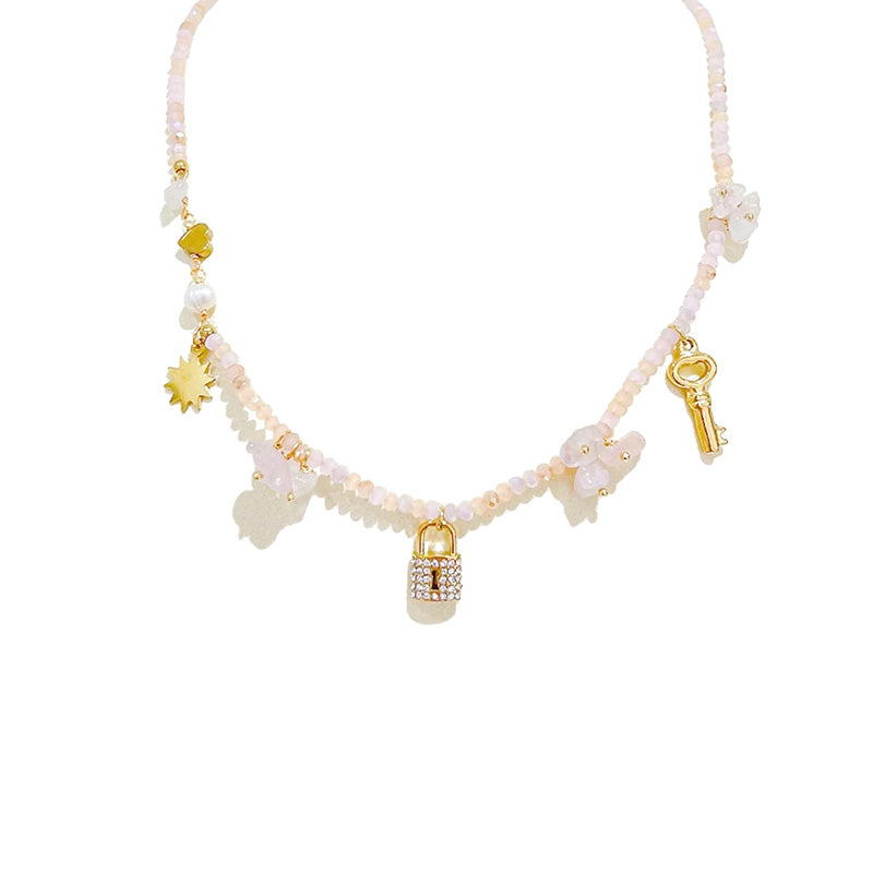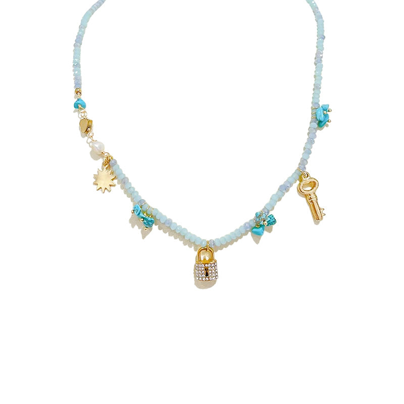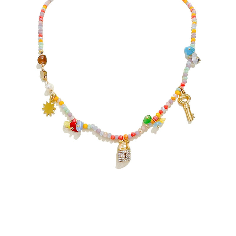 Secret Code è una collana ricoperta di perline colorate, arricchita da mini charm pendenti tra cui una chiave, un lucchetto e piccole pietre naturali. Ogni elemento è pensato per aggiungere un tocco simbolico e originale al tuo look, con uno stile allegro ma curato nei dettagli.