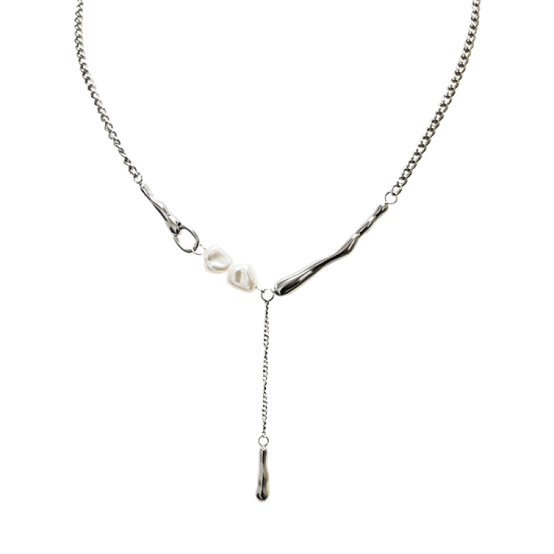 Silver Flow è una collana a Y dal design minimal ma sofisticato: la catena da 3 mm si unisce in un incrocio con due perle centrali, da cui parte un pendente fluido in acciaio che valorizza il décolleté con eleganza.