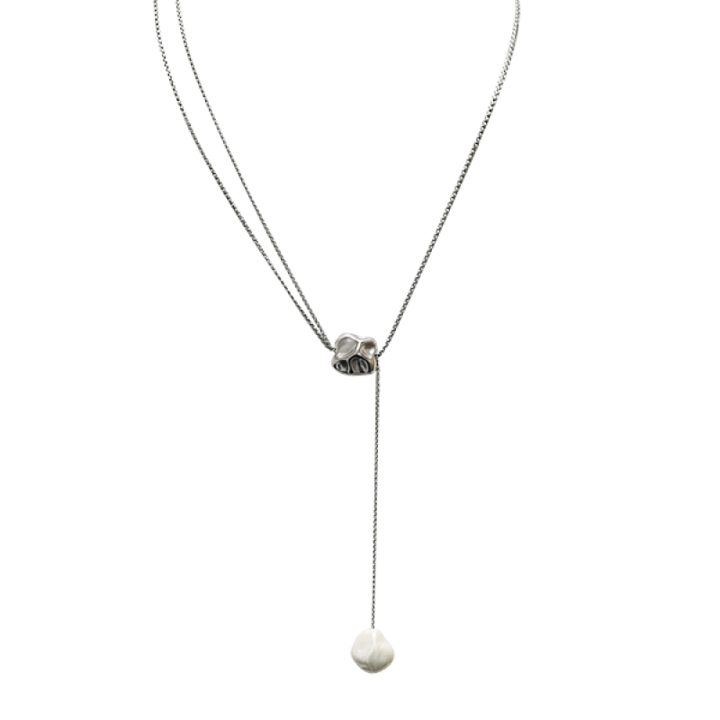 Silver Swing è una collana regolabile a saliscendi con un design semplice ma ricco di fascino: una sfera centrale martellata cattura la luce, mentre una perla pendente scivola delicatamente lungo la catena, creando un effetto raffinato e dinamico.