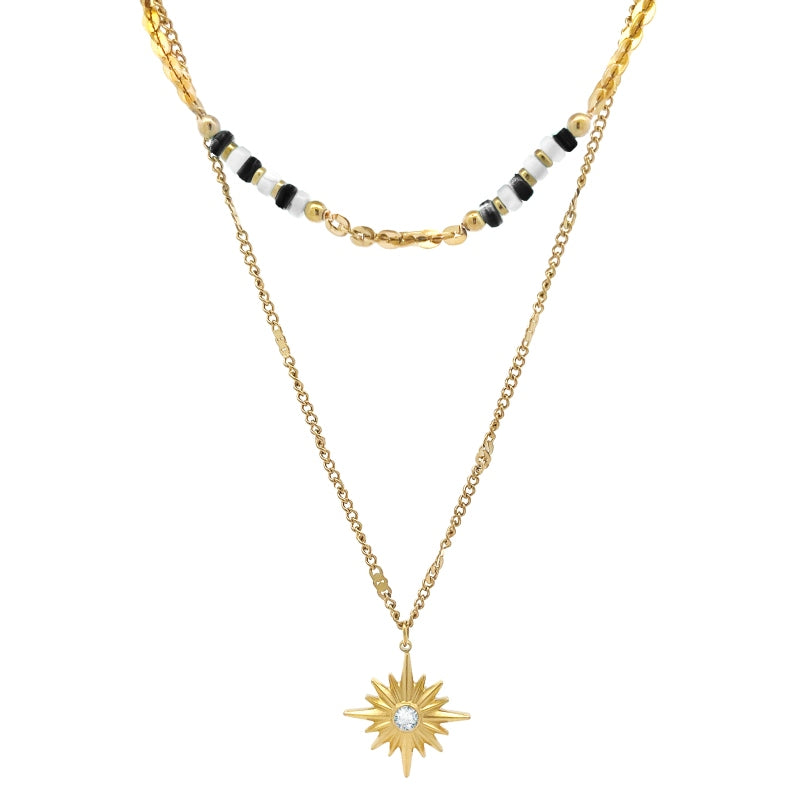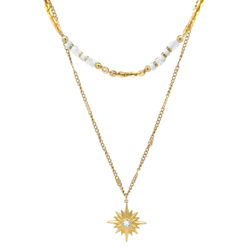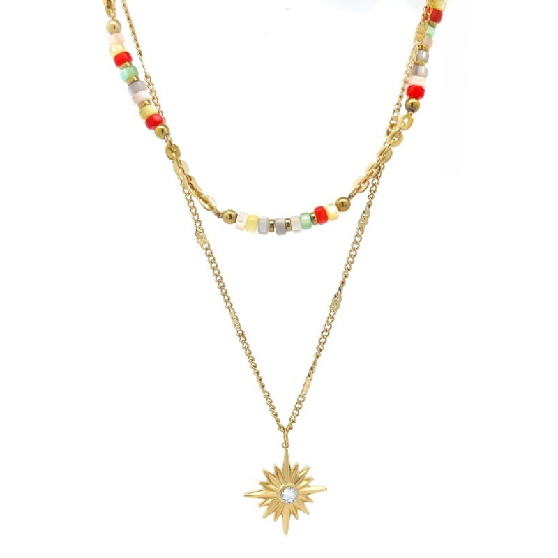 Sunlight è una collana a doppio filo dorato: il filo più corto è decorato con perline colorate, mentre su quello più lungo brilla un ciondolo a forma di sole, con uno zircone centrale che cattura la luce a ogni movimento.