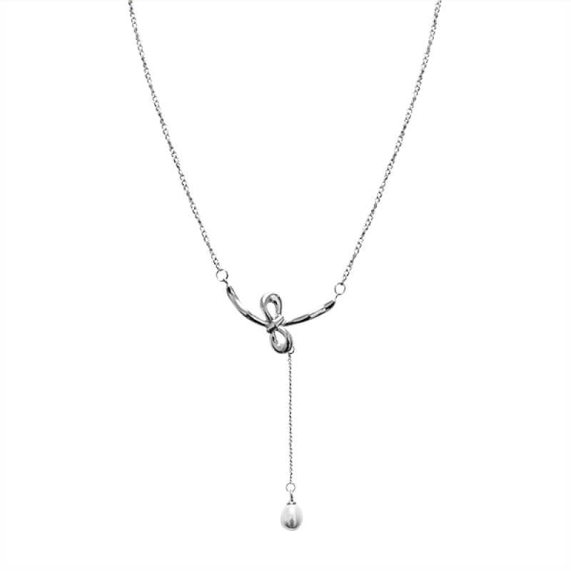 Grace Bow è una collana a Y con un fiocco centrale in acciaio (3,4 x 2 cm) e una perla pendente che scende leggera lungo il décolleté. Un design delicato ma scenografico, perfetto per impreziosire anche il look più semplice.