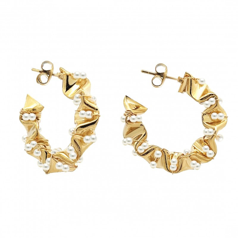 Gli orecchini Cerchio Scrunch uniscono la texture stropicciata del metallo alla morbidezza delle perline bianche, per un risultato leggero ma d’impatto.