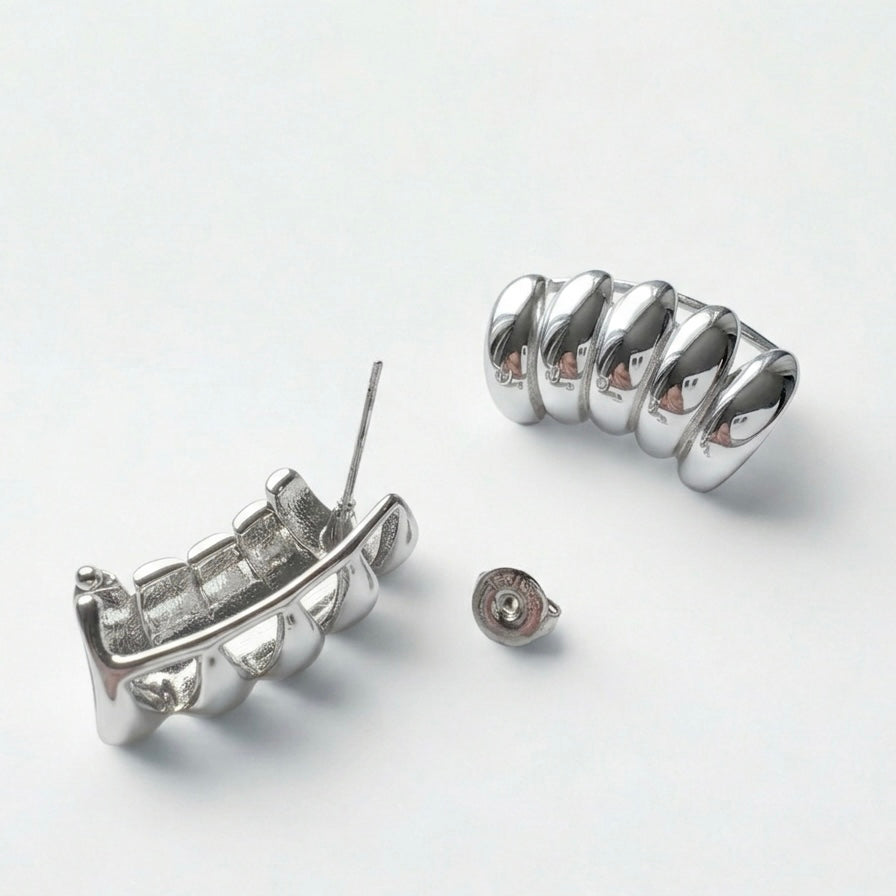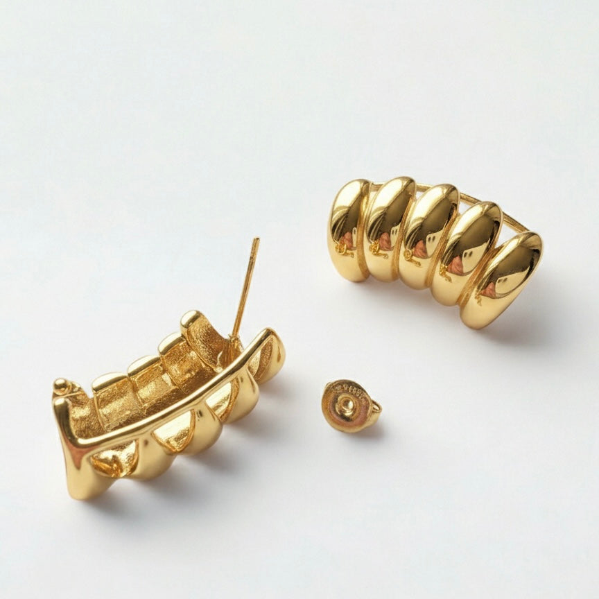 L’Orecchino Frame è progettato per incorniciare l’orecchio con una struttura ampia e modulare composta da elementi bombati in sequenza. Il doppio sistema di sostegno (foro + aggancio superiore) garantisce stabilità e comfort anche grazie alla lunghezza e al volume del design, permettendo di indossarlo da solo come pezzo protagonista.