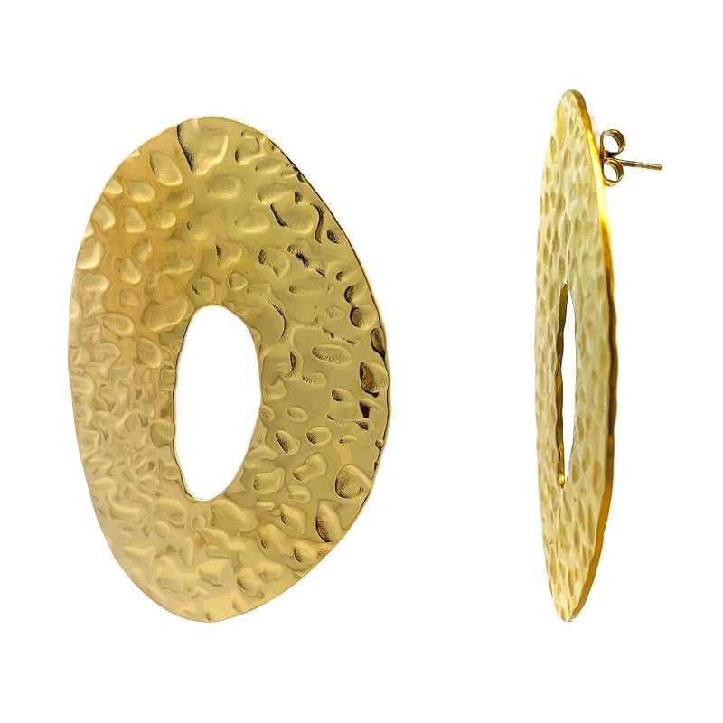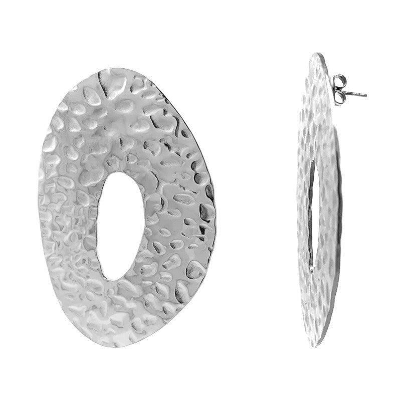 Gli Oval Bold sono orecchini a lobo oversize dalla forma ovale irregolare con superficie martellata, pensati per chi ama accessori grandi ma essenziali nel design.