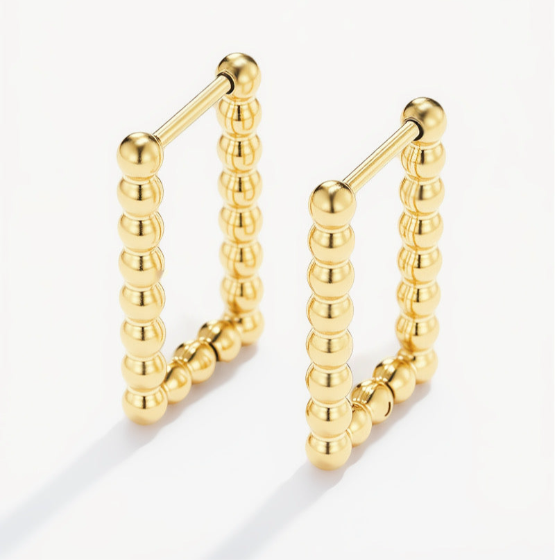 Orecchini a cerchio rettangolare gold, formati da piccole sfere: un design geometrico ma delicato, perfetto per un look moderno e distintivo.