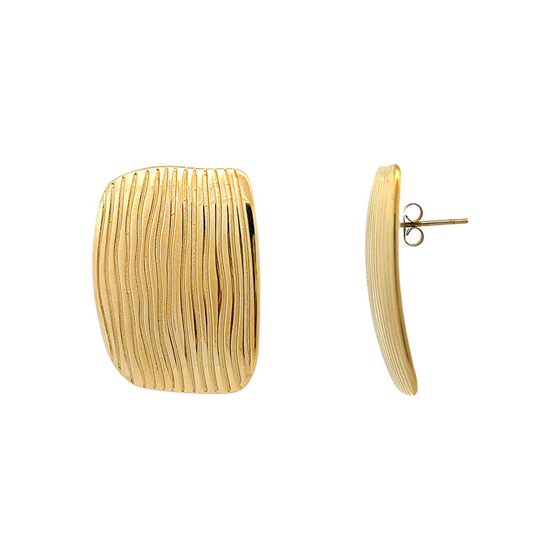 Gli orecchini Stripes hanno una forma rettangolare non perfetta e una superficie zigrinata, attraversata da righe irregolari che riflettono la luce in modo originale.