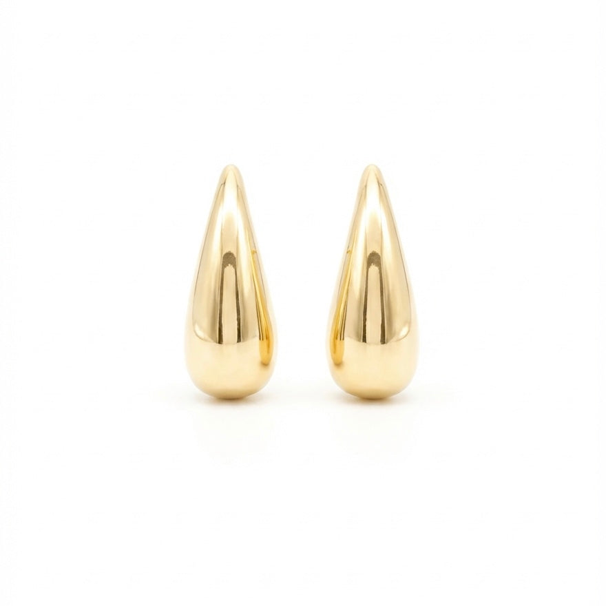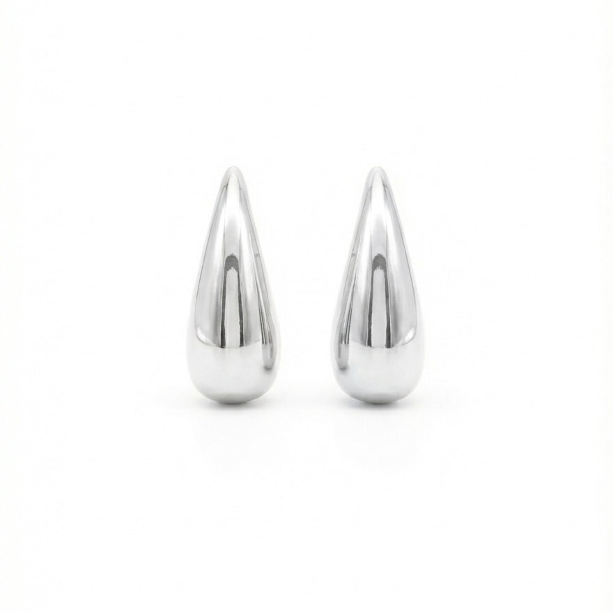 Orecchini in acciaio inox a forma allungata e morbida, ispirata a una goccia in movimento.