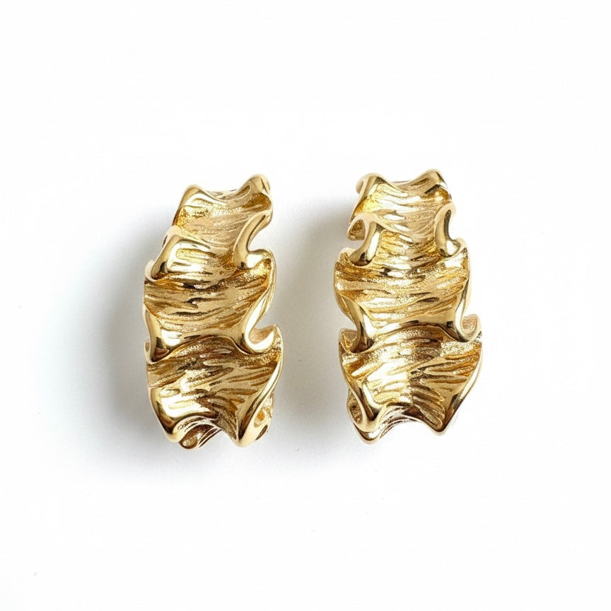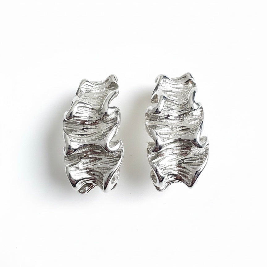 Orecchini in acciaio inox con forma ampia e texture ondulata effetto stropicciato, pieni e strutturati.