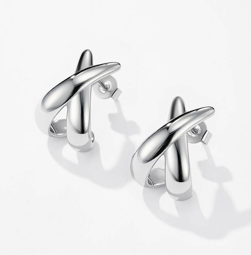 Orecchini a lobo a forma di X in acciaio lucido: un design essenziale ma deciso, perfetto da portare ogni giorno in versione gold o silver.