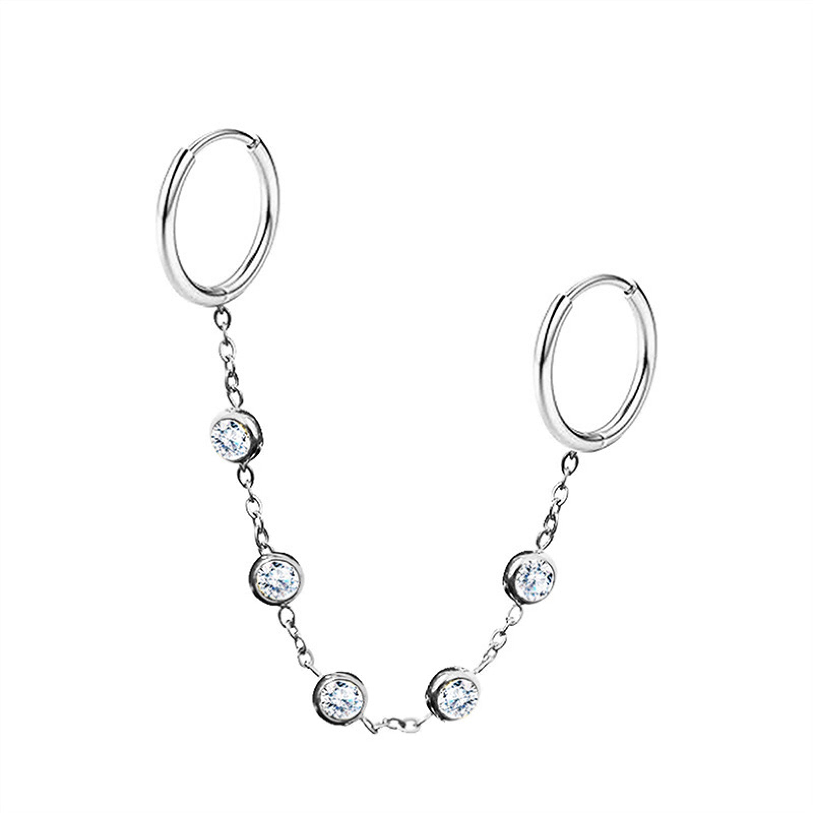 Monorecchino con doppio cerchietto collegato da una catenella luminosa, pensato per dare luce all’orecchio senza appesantire.