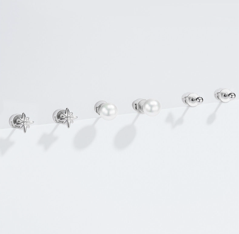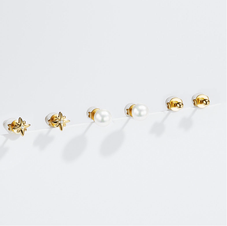 Set da tre coppie di orecchini a lobo “tappabuco”: una stella polare zirconata, una perla bianca e una sfera lucida. Minimal ma versatili, perfetti da abbinare tra loro o da indossare singolarmente. Disponibili sia gold che silver.